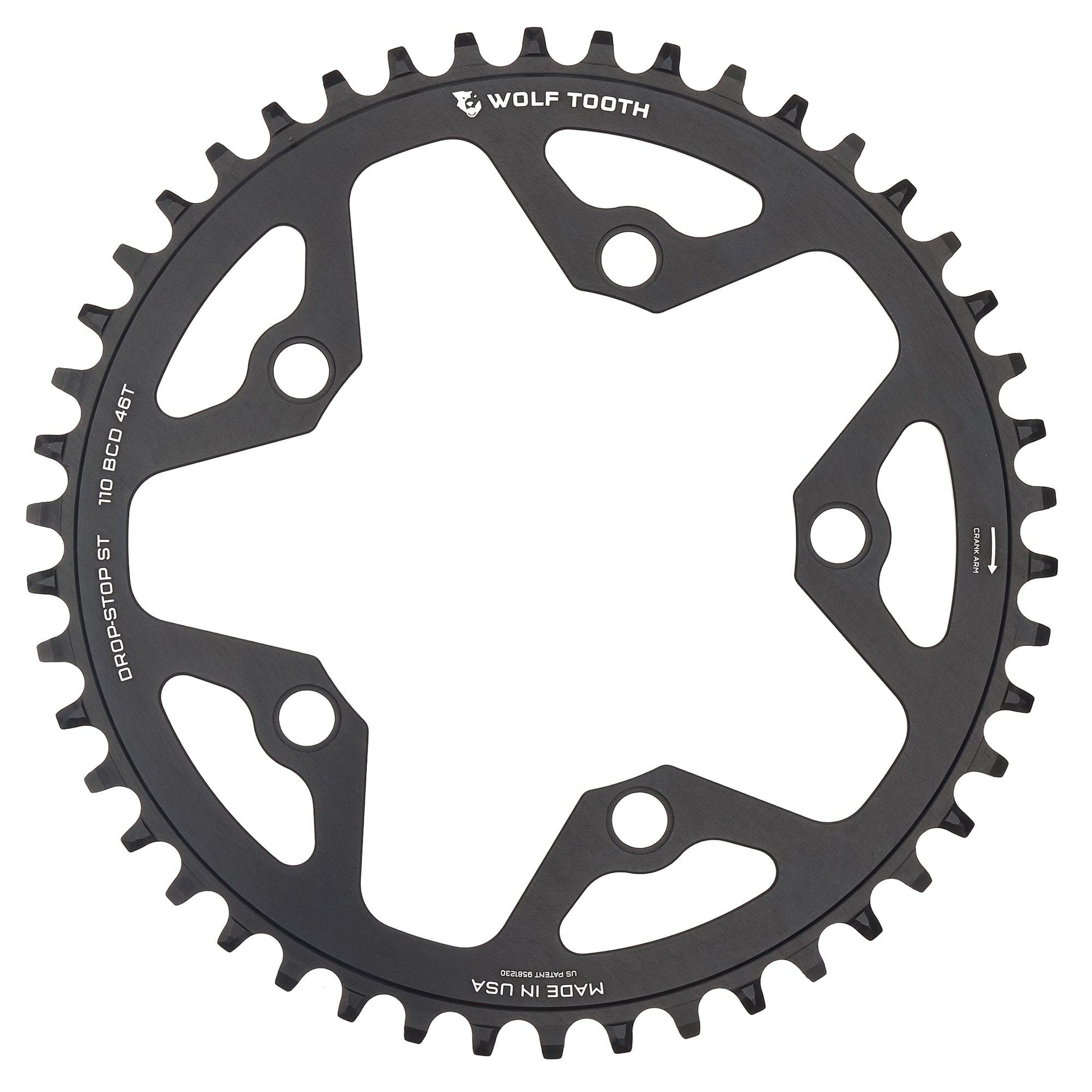 Drop-Stop technology. On Wolf Tooth’s patented wide/narrow chainring, the wide side of the tooth has maximum contact on the drive side which spreads the load and improves chainring life. The narrow side allows clearance for mud and debris which reduces friction.