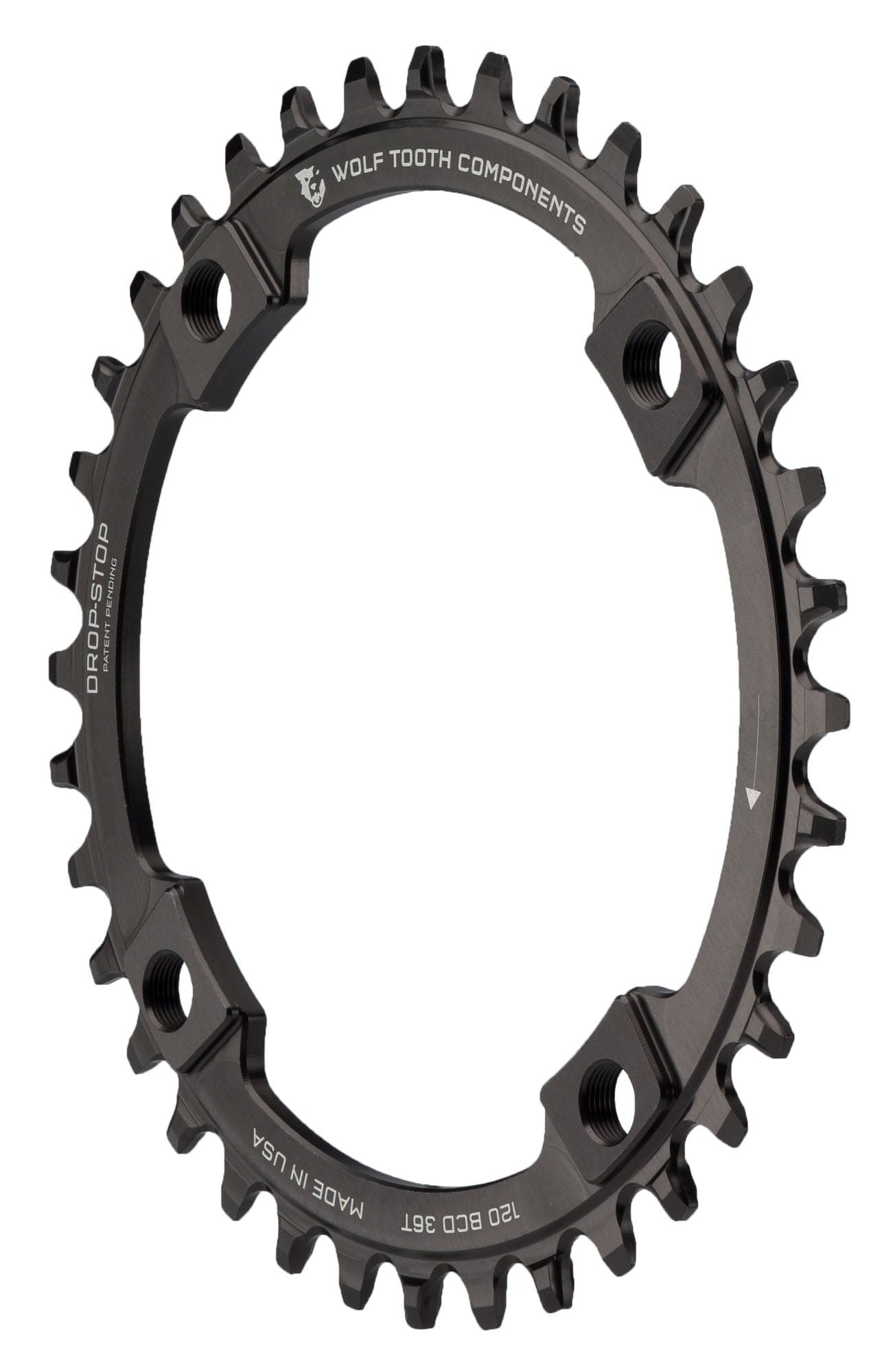 Drop-Stop technology. On Wolf Tooth’s patented wide/narrow chainring, the wide side of the tooth has maximum contact on the drive side which spreads the load and improves chainring life. The narrow side allows clearance for mud and debris which reduces friction.