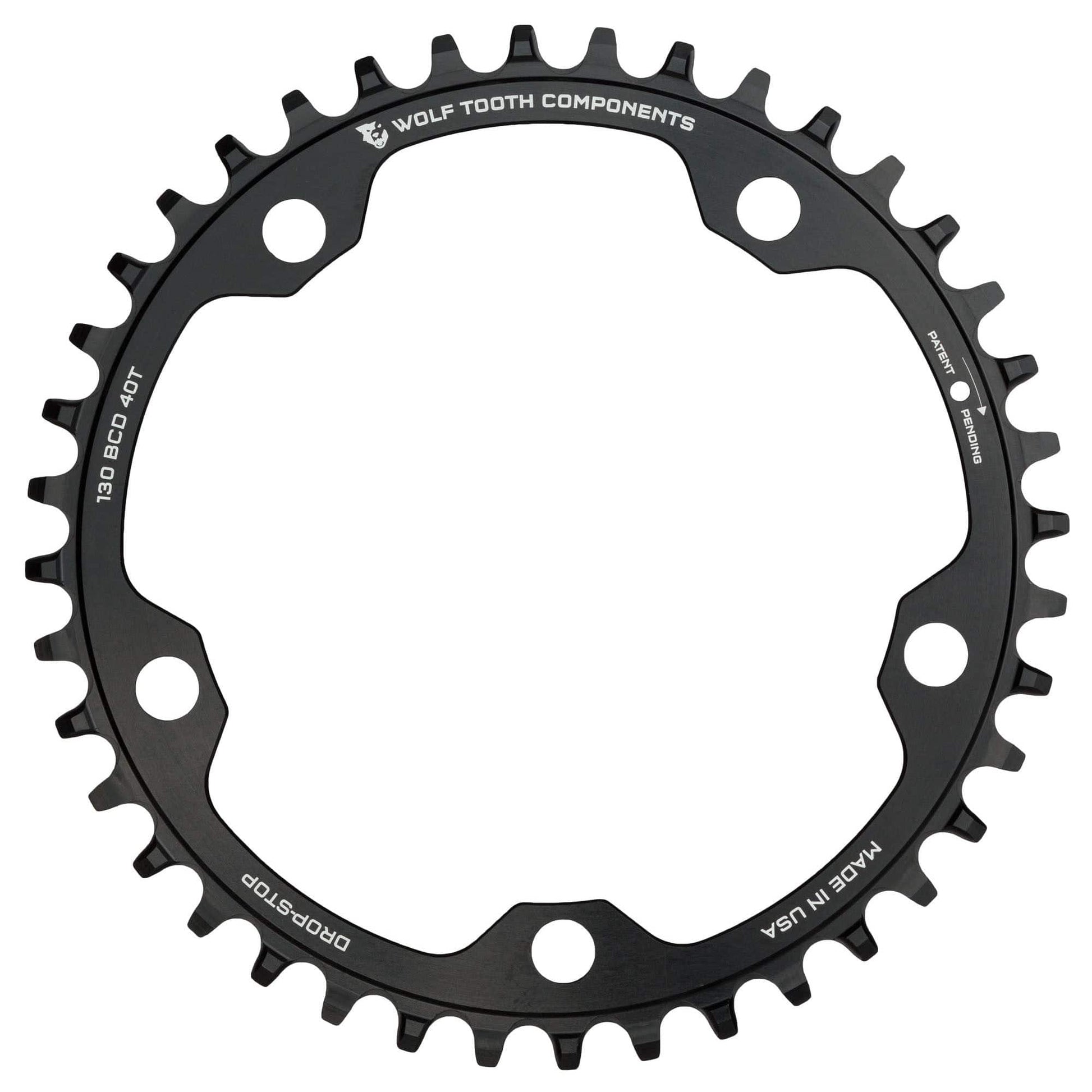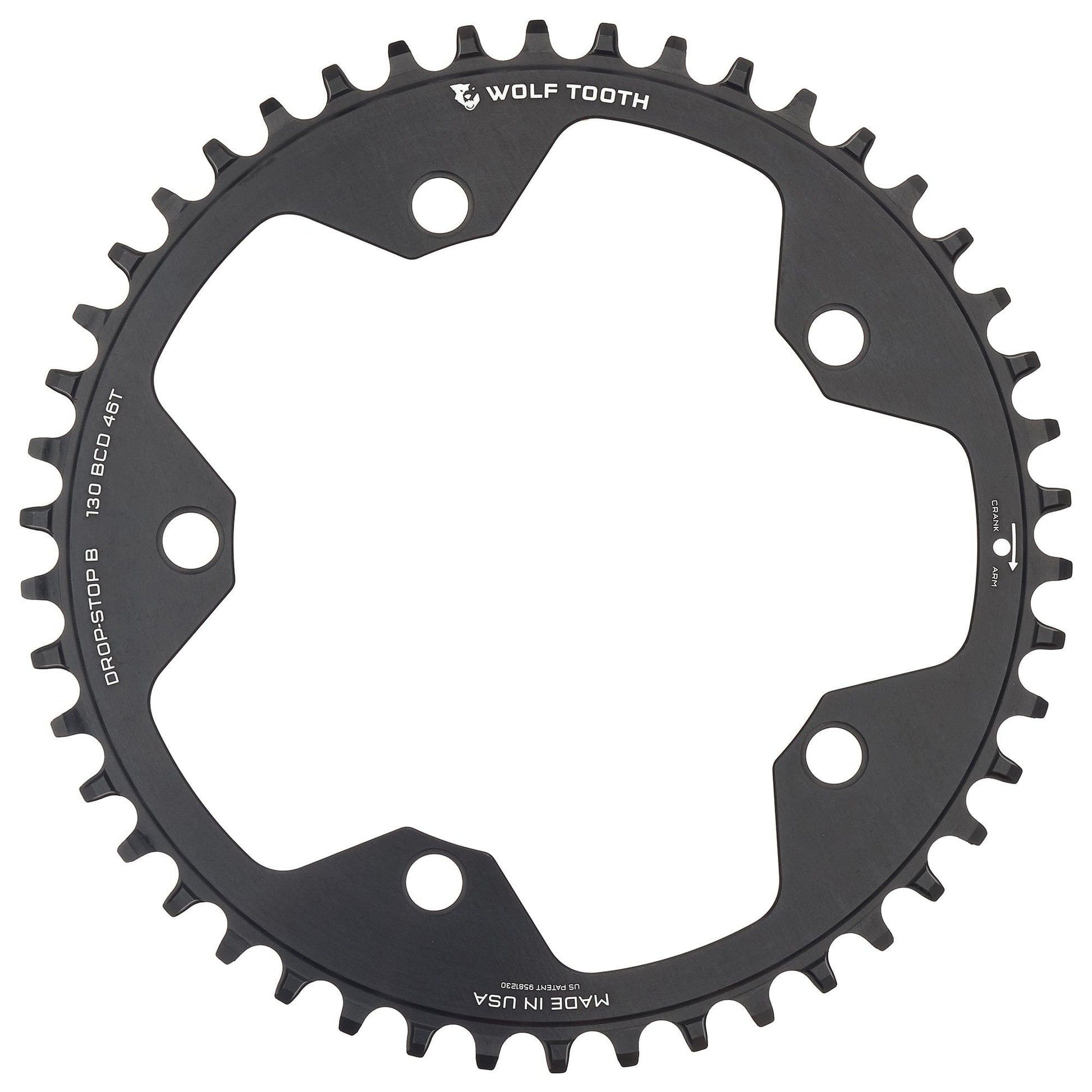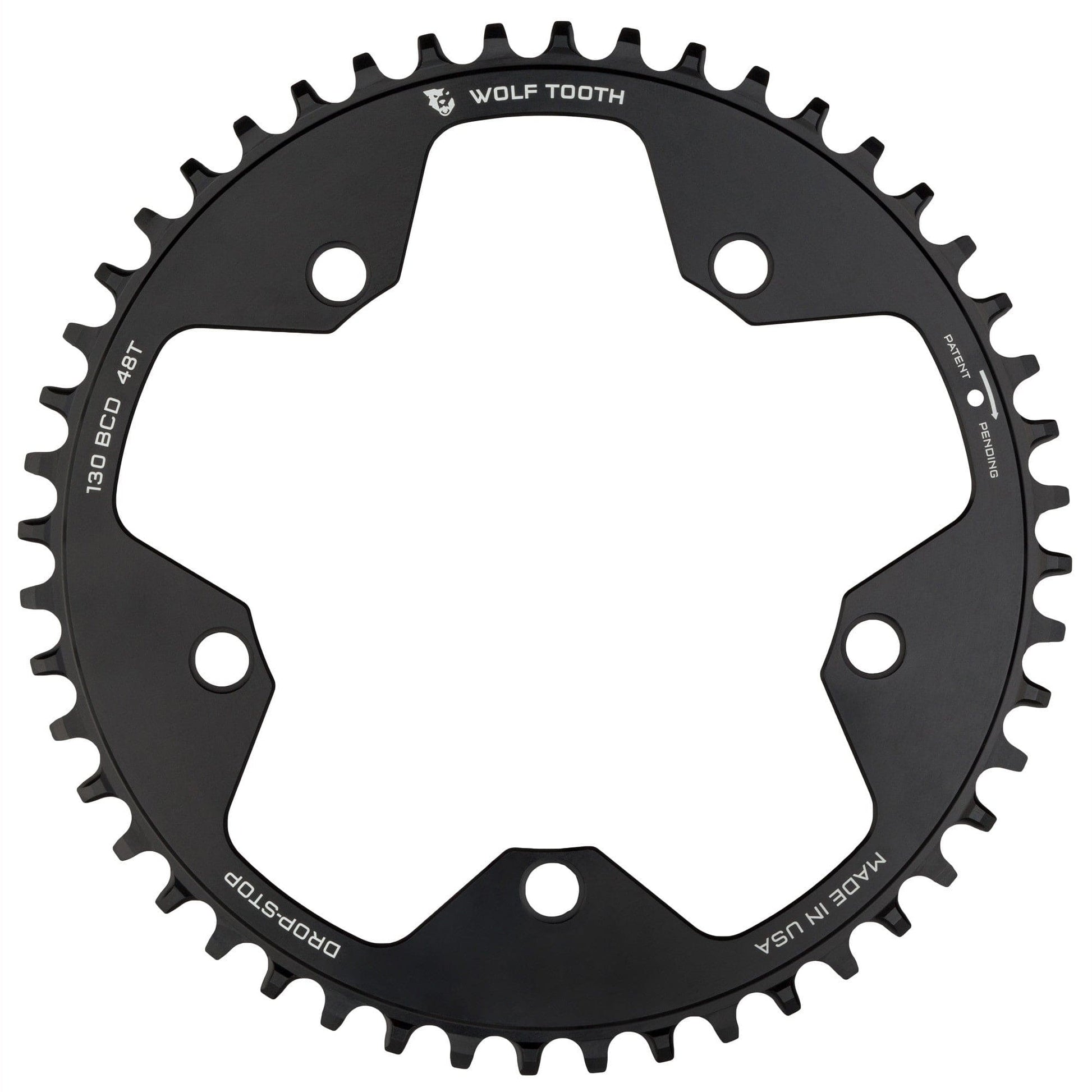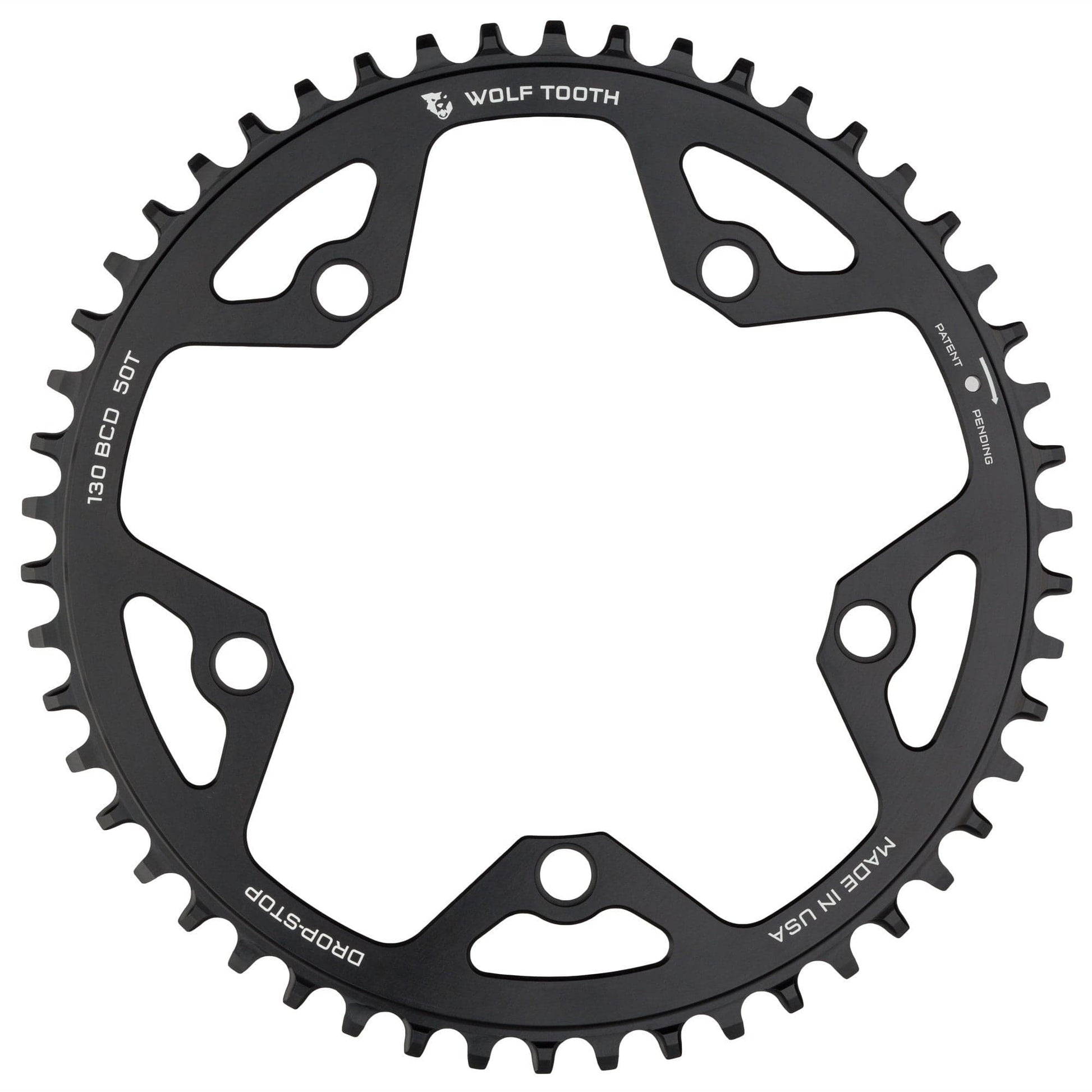 Drop-Stop technology. On Wolf Tooth’s patented wide/narrow chainring, the wide side of the tooth has maximum contact on the drive side which spreads the load and improves chainring life. The narrow side allows clearance for mud and debris which reduces friction.