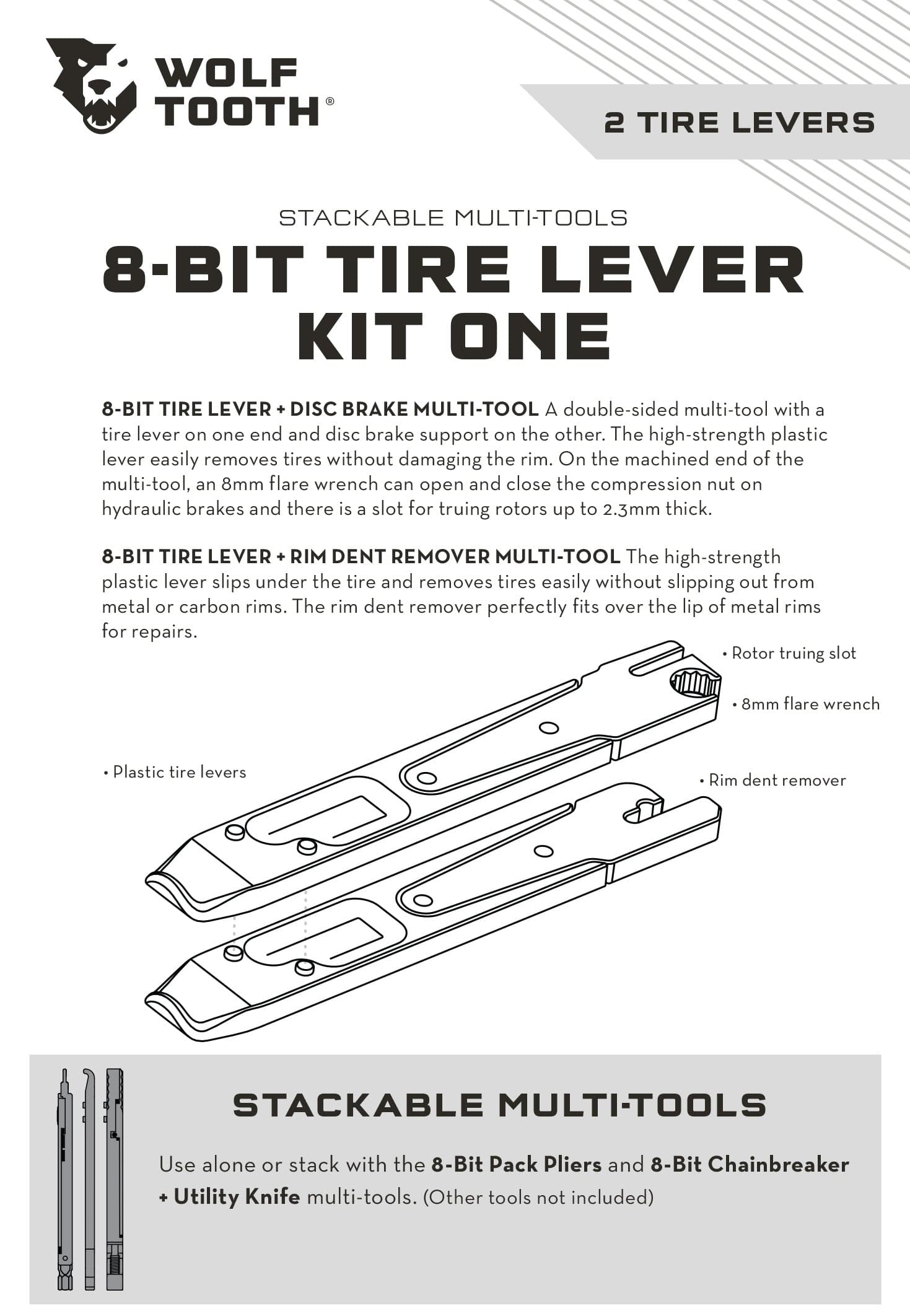 8-BIT TIRE LEVER + DISC BRAKE MULTI-TOOL A double-sided multi-tool with a tire lever on one end and disc brake support on the other. The high-strength plastic lever easily removes tires without damaging the rim. On the machined end of the multi-tool, an 8mm flare wrench can open and close the compression nut on hydraulic brakes and there is a slot for truing rotors up to 2.5mm thick.