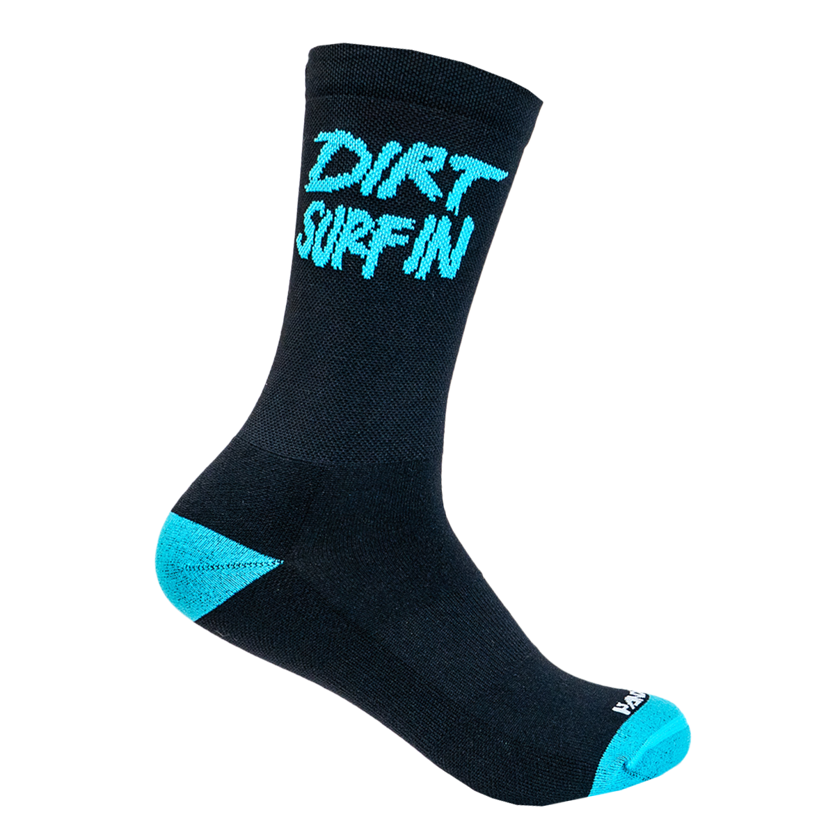 You're flying down the trail, tires floating on top of a bed of loam, just like a surf board on the water. That is what we were dreamin' of when we created the Dirt Surfin' socks. It's an ode to those rare days when everything is hookin' up, and all you need to do is hang loose and dirt surf!
